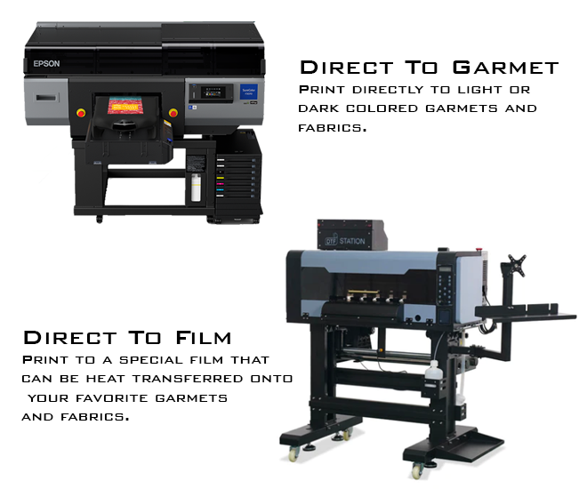 Direct To Garmet allows us to print directly on light, or dark collor fabrics. Direct To Film allows the same, but we can print designs and store for later, or print your designs and ship them directly to you for you to heat press to your own materials!